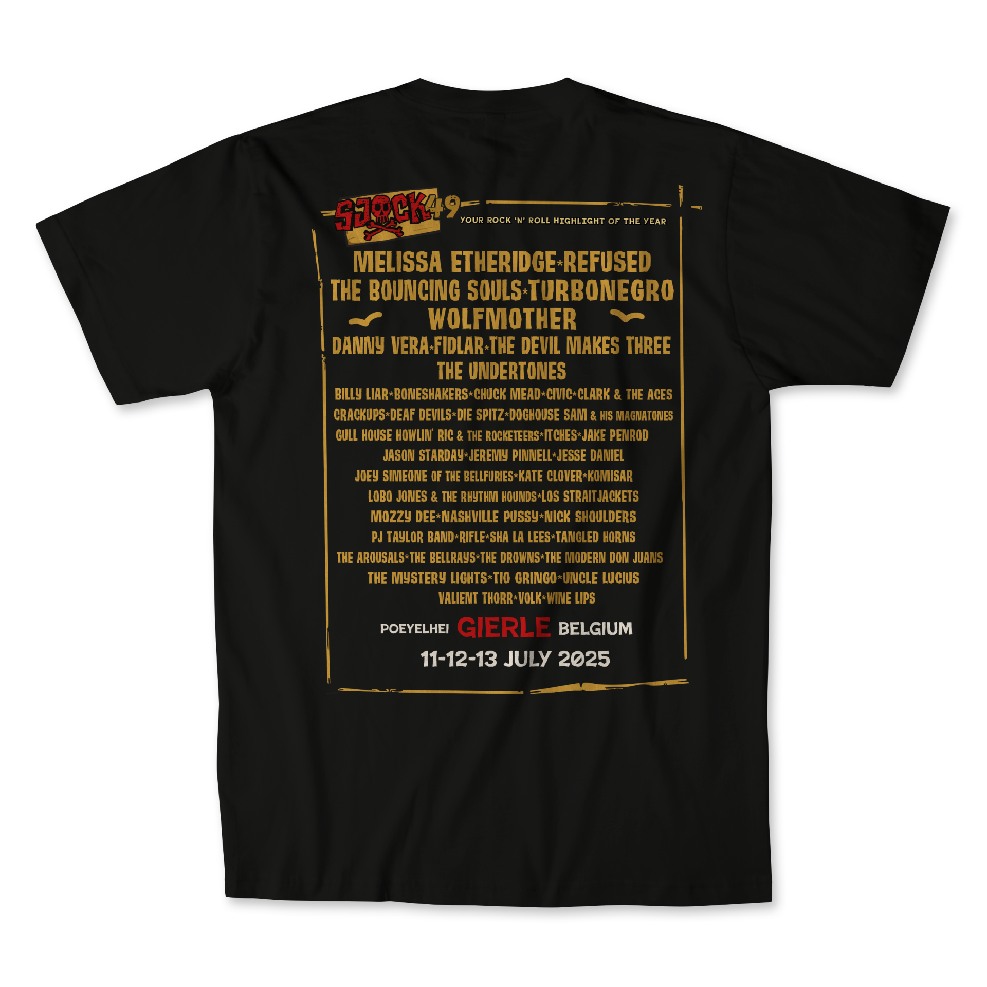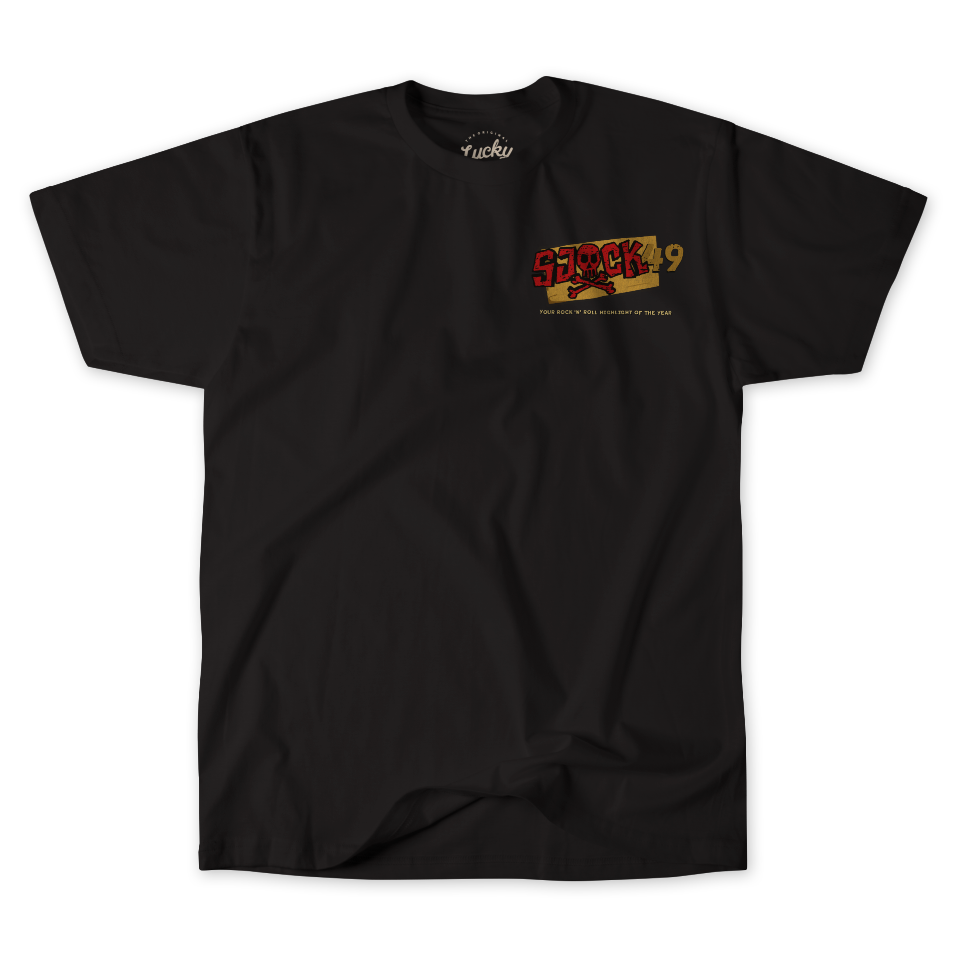 BLACK SJOCK TEE MADE OF 100% COTTON WITH THE LINE UP OF EDITION 49 PRINTED ON THE BACK ON THE FRONT IT HAS A SMALL EDITION 49 PRINT.